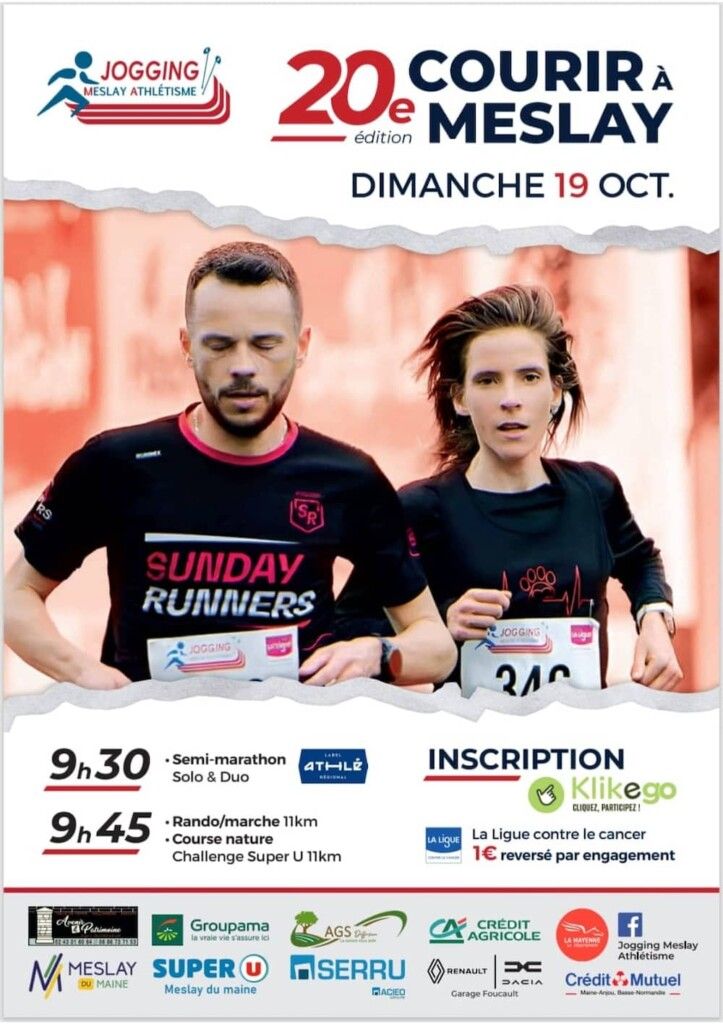 Le dimanche 19 octobre 2025, la commune de Meslay-du-Maine accueillera la 20e édition de l'événement sportif « Courir à Meslay ». Organisée par le club Jogging Meslay Athlétisme, cette manifestation propose plusieurs courses adaptées à tous les niveaux.