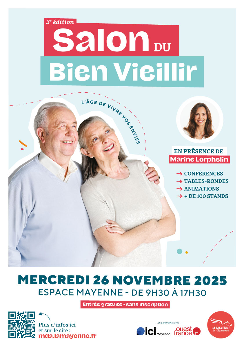 Le mercredi 26 novembre 2025, de 9h30 à 17h30 le Département de la Mayenne donne rendez-vous à tous les Mayennais pour la 3ᵉ édition du Salon du Bien Vieillir, à Espace Mayenne.